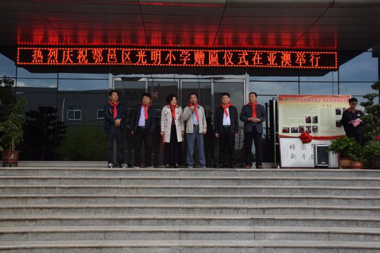 2018年4月28日上午10時,西安市鄠邑區光明小學為亞澳農機總部贈匾儀式順利舉行,鄠邑區政府辦副主任、機關事務管理局局長滑益平,區經貿局副局長趙曉利,區中小企業服務中心趙建威,區光明小學校長馬文博、副校長張忠偉、王冰榮及老師、同學們,以及亞澳農機董事長史可器、總經理史森強、副總經理史炳直等亞澳全體管理干部及黨員、工會委員、職工代表等參加活動。局副局長趙曉